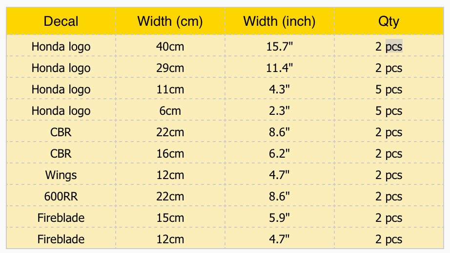 For customization requests, alternate sizes, color mixing, or personalized sets, reach out to us via WhatsApp. The product image showcases the included stickers and their sizes, ensuring transparency and accuracy in your order. Don't miss the chance to elevate your Honda CBR FireBlade's aesthetics with our superb sticker decal set!"